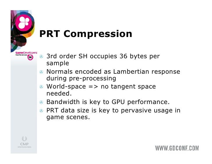 42. 42. PRT Compression   3rd order SH occupies 36 bytes per sample   Normals encoded as Lambertian response during pre-processing   World-space => no tangent space needed.   Bandwidth is key to GPU performance.   PRT data size is key to pervasive usage in game scenes.