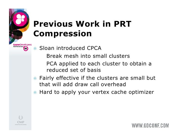 43. 43. Previous Work in PRT Compression   Sloan introduced CPCA   Break mesh into small clusters   PCA applied to each cluster to obtain a reduced set of basis   Fairly effective if the clusters are small but that will add draw call overhead   Hard to apply your vertex cache optimizer