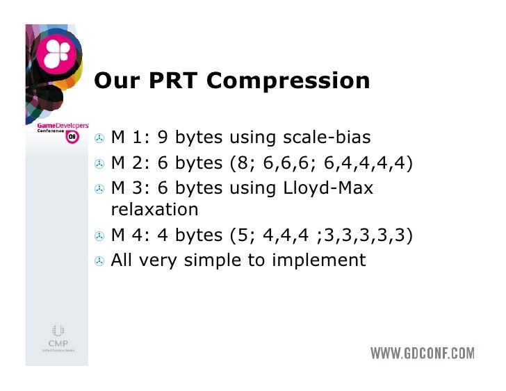 44. 44. Our PRT Compression   M 1: 9 bytes using scale-bias   M 2: 6 bytes (8; 6,6,6; 6,4,4,4,4)   M 3: 6 bytes using Lloyd-Max relaxation   M 4: 4 bytes (5; 4,4,4 ;3,3,3,3,3)   All very simple to implement