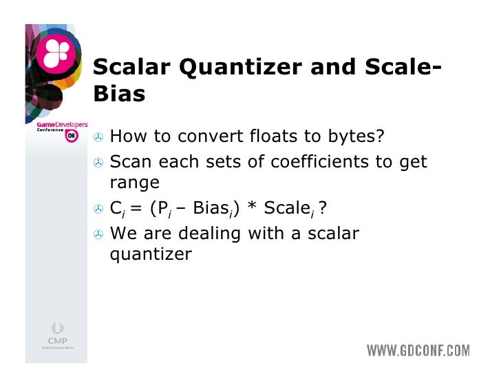 45. 45. Scalar Quantizer and Scale- Bias   How to convert floats to bytes?   Scan each sets of coefficients to get range   Ci = (Pi – Biasi) * Scalei ?   We are dealing with a scalar quantizer