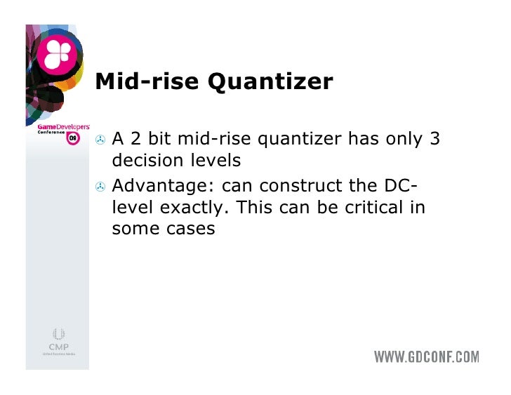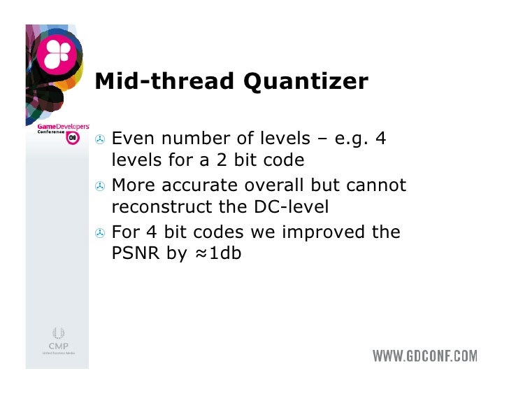 48. 48. Mid-thread Quantizer   Even number of levels – e.g. 4 levels for a 2 bit code   More accurate overall but cannot reconstruct the DC-level   For 4 bit codes we improved the PSNR by ≈1db
