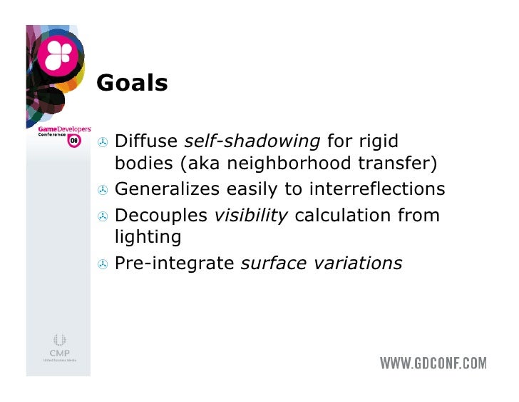 4. 4. Goals   Diffuse self-shadowing for rigid bodies (aka neighborhood transfer)   Generalizes easily to interreflections   Decouples visibility calculation from lighting   Pre-integrate surface variations