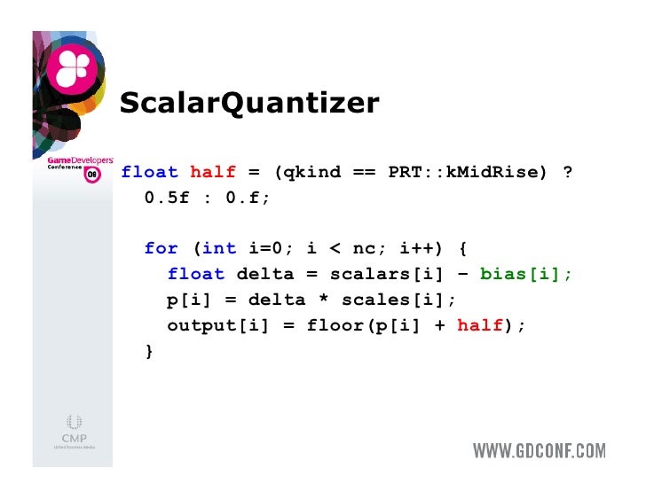 49. 49. ScalarQuantizer float half = (qkind == PRT::kMidRise) ? 0.5f : 0.f; for (int i=0; i < nc; i++) { float delta = scalars[i] – bias[i]; p[i] = delta * scales[i]; output[i] = floor(p[i] + half); }