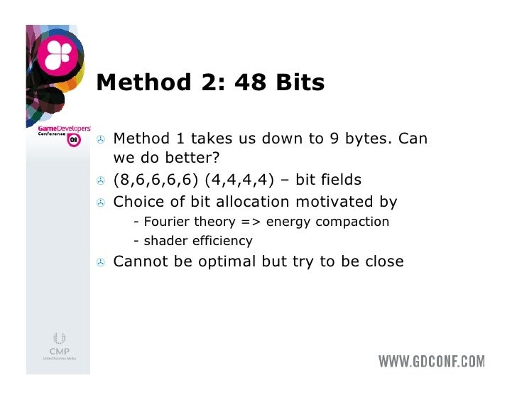 51. 51. Method 2: 48 Bits   Method 1 takes us down to 9 bytes. Can we do better?   (8,6,6,6,6) (4,4,4,4) – bit fields   Choice of bit allocation motivated by •  - Fourier theory => energy compaction   - shader efficiency   Cannot be optimal but try to be close
