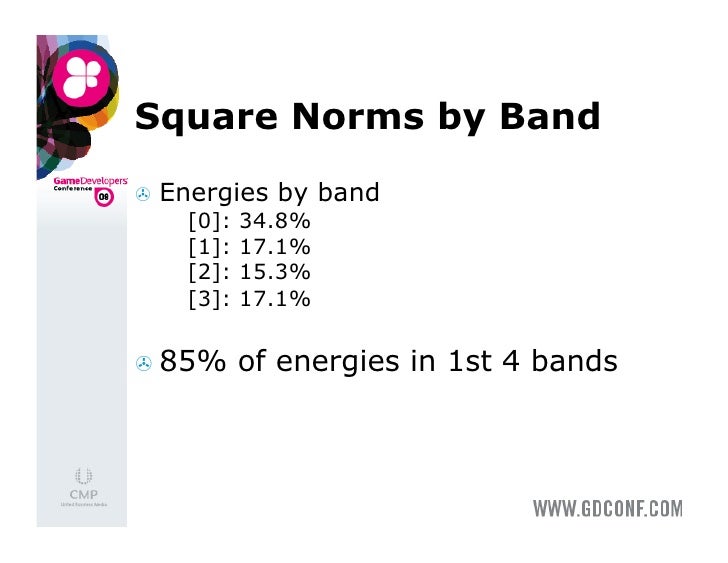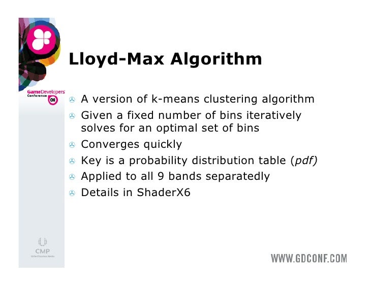 60. 60. Lloyd-Max Algorithm   A version of k-means clustering algorithm   Given a fixed number of bins iteratively solves for an optimal set of bins   Converges quickly   Key is a probability distribution table (pdf)   Applied to all 9 bands separatedly   Details in ShaderX6