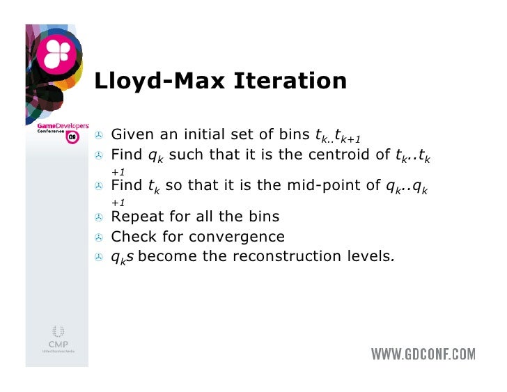 61. 61. Lloyd-Max Iteration   Given an initial set of bins tk..tk+1   Find qk such that it is the centroid of tk..tk +1   Find tk so that it is the mid-point of qk..qk +1   Repeat for all the bins   Check for convergence   qks become the reconstruction levels.