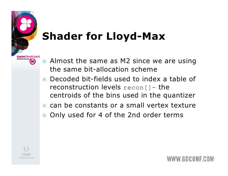 64. 64. Shader for Lloyd-Max   Almost the same as M2 since we are using the same bit-allocation scheme   Decoded bit-fields used to index a table of reconstruction levels recon[]- the centroids of the bins used in the quantizer   can be constants or a small vertex texture   Only used for 4 of the 2nd order terms