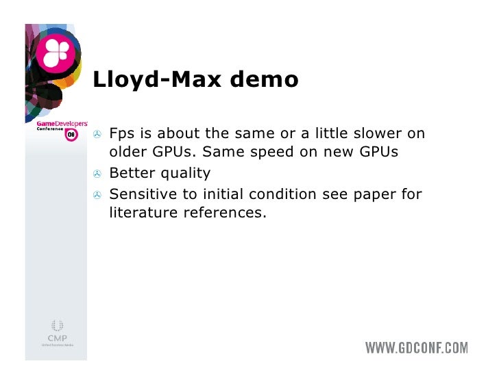65. 65. Lloyd-Max demo   Fps is about the same or a little slower on older GPUs. Same speed on new GPUs   Better quality   Sensitive to initial condition see paper for literature references.
