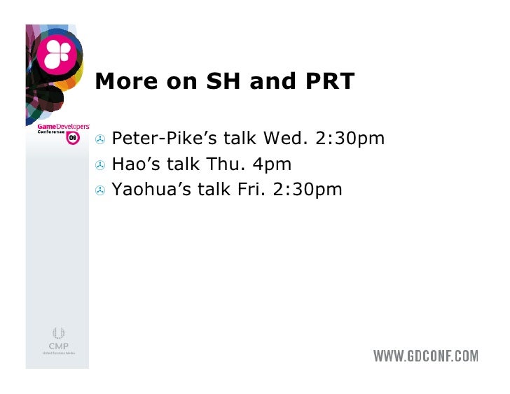 73. 73. More on SH and PRT   Peter-Pike’s talk Wed. 2:30pm   Hao’s talk Thu. 4pm   Yaohua’s talk Fri. 2:30pm