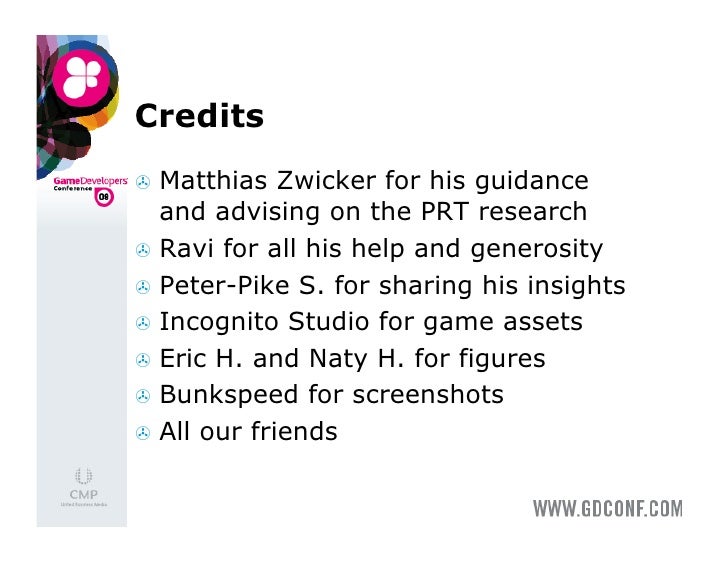 75. 75. Credits   Matthias Zwicker for his guidance and advising on the PRT research   Ravi for all his help and generosity   Peter-Pike S. for sharing his insights   Incognito Studio for game assets   Eric H. and Naty H. for figures   Bunkspeed for screenshots   All our friends