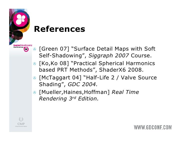 76. 76. References   [Green 07] “Surface Detail Maps with Soft Self-Shadowing”, Siggraph 2007 Course.   [Ko,Ko 08] “Practical Spherical Harmonics based PRT Methods”, ShaderX6 2008.   [McTaggart 04] “Half-Life 2 / Valve Source Shading”, GDC 2004.   [Mueller,Haines,Hoffman] Real Time Rendering 3rd Edition.