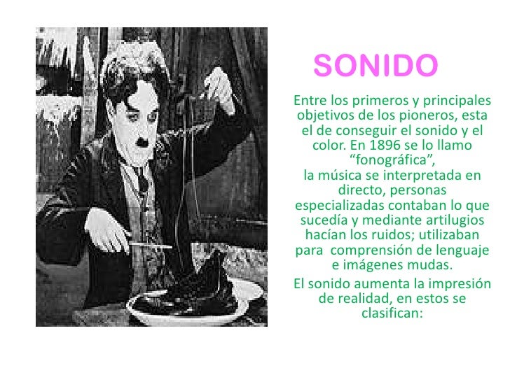 5. 5. SONIDO<br />Entre los primeros y principales objetivos de los pioneros, esta el de conseguir el sonido y el color. En 1896 se lo llamo “fonográfica”,la música se interpretada en directo, personas especializadas contaban lo que sucedía y mediante artilugios hacían los ruidos; utilizaban para comprensión de lenguaje e imágenes mudas. <br />El sonido aumenta la impresión de realidad, en estos se clasifican:<br />