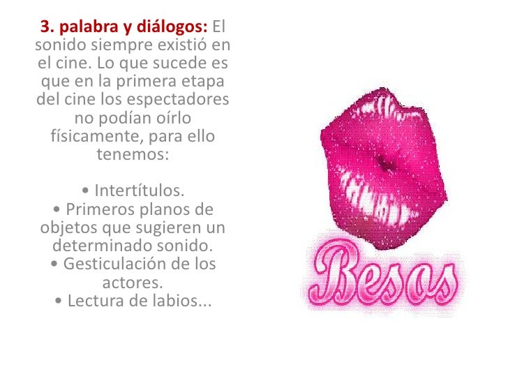 8. 8. 3. palabra y diálogos: El sonido siempre existió en el cine. Lo que sucede es que en la primera etapa del cine los espectadores no podían oírlo físicamente, para ello tenemos:• Intertítulos.• Primeros planos de objetos que sugieren un determinado sonido.• Gesticulación de los actores.• Lectura de labios...<br />