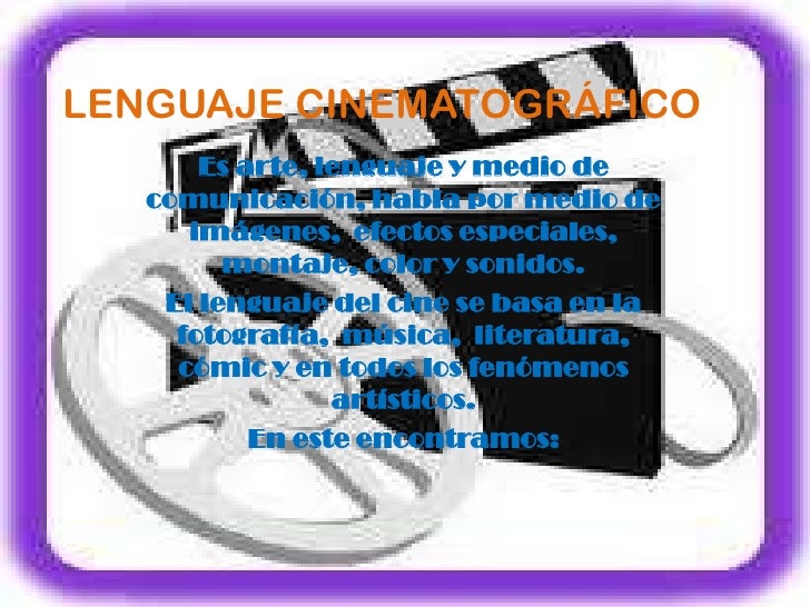 2. 2. LENGUAJE CINEMATOGRÁFICO<br />Es arte, lenguaje y medio de comunicación, habla por medio de imágenes, efectos especiales, montaje, color y sonidos. <br />El lenguaje del cine se basa en la fotografía, música, literatura, cómic y en todos los fenómenos artísticos. <br />En este encontramos:<br />