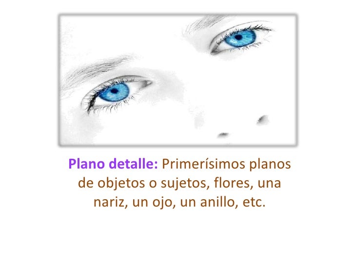 49. 49. El plano detalle: es un plano muy cercano a la imagen. Este tipo de planos son difíciles de emplear con exactitud, ya que pueden confundir al espectador al no dar buena información ni del entorno ni del sujeto (Los detalles se agrandan demasiado). Este también suele confundirse con el concepto de foto macro, y no es lo mismo. El plano detalle muestra pequeños detalles que en un plano "normal" pasaría desapercibido. <br />