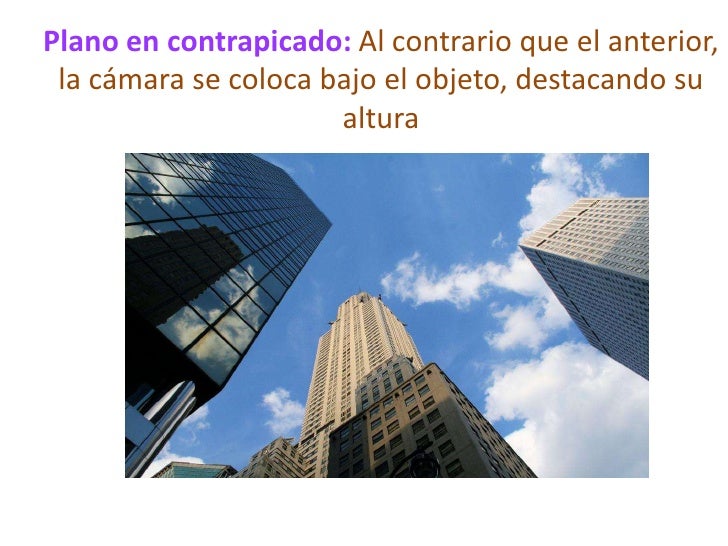 26. 26. Plano en contrapicado: Al contrario que el anterior, la cámara se coloca bajo el objeto, destacando su altura<br />