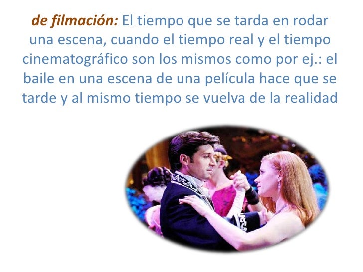 33. 33. de filmación:El tiempo que se tarda en rodar una escena, cuando el tiempo real y el tiempo cinematográfico son los mismos como por ej.: el baile en una escena de una película hace que se tarde y al mismo tiempo se vuelva de la realidad<br />