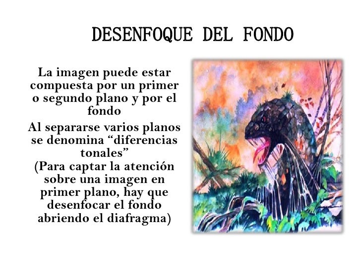 42. 42. DESENFOQUE DEL FONDO<br />La imagen puede estar compuesta por un primer o segundo plano y por el fondo<br />Al separarse varios planos se denomina “diferencias tonales”(Para captar la atención sobre una imagen en primer plano, hay que desenfocar el fondo abriendo el diafragma)<br />