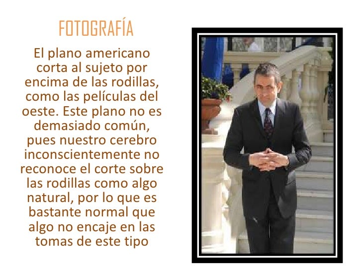 44. 44. FOTOGRAFÍA<br />El plano americano corta al sujeto por encima de las rodillas, como las películas del oeste. Este plano no es demasiado común, pues nuestro cerebro inconscientemente no reconoce el corte sobre las rodillas como algo natural, por lo que es bastante normal que algo no encaje en las tomas de este tipo<br />