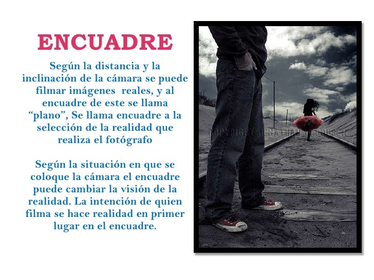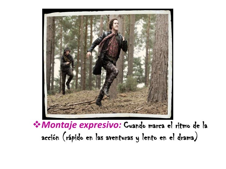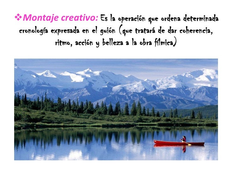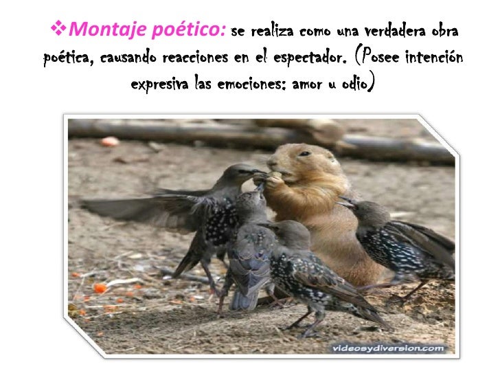 4. 4. <ul><li>montaje narrativo:Cuenta hechos (Ya sea en lo cronológico o mezclándolo con el tiempo)</li></li></ul><li><ul><li>Montaje expresivo:Cuando marca el ritmo de la acción (rápido en las aventuras y lento en el drama)</li></li></ul><li><ul><li>Montaje ideológico:Cuando quiere utilizar las emociones (basándose en símbolos, gestos, imágenes, sonidos etc.) </li></li></ul><li><ul><li>Montaje creativo:Es la operación que ordena determinada cronología expresada en el guión (que tratará de dar coherencia, ritmo, acción y belleza a la obra fílmica) </li></li></ul><li><ul><li>Montaje poético:se realiza como una verdadera obra poética, causando reacciones en el espectador. (Posee intención expresiva las emociones: amor u odio)</li></li></ul><li>ENCUADRE<br />Según la distancia y la inclinación de la cámara se puede filmar imágenes reales, y al encuadre de este se llama “plano”, Se llama encuadre a la selección de la realidad que realiza el fotógrafo Según la situación en que se coloque la cámara el encuadre puede cambiar la visión de la realidad. La intención de quien filma se hace realidad en primer lugar en el encuadre.<br />