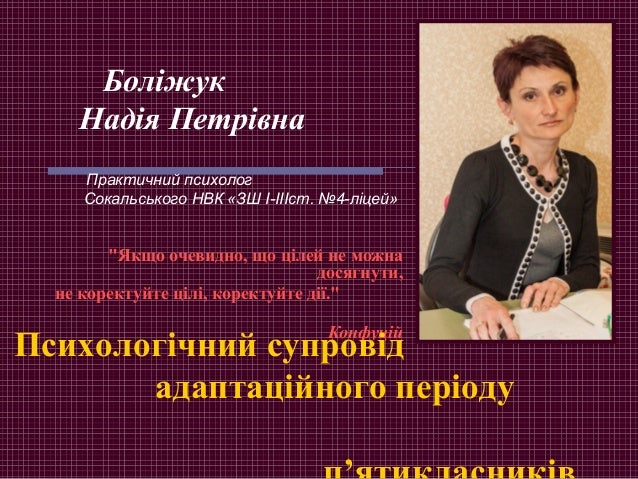 1. 1. "Якщо очевидно, що цілей не можна досягнути, не коректуйте цілі, коректуйте дії." Конфуцій Боліжук Надія Петрівна Практичний психолог Сокальського НВК «ЗШ І-ІІІст. №4-ліцей» Психологічний супровід адаптаційного періоду
