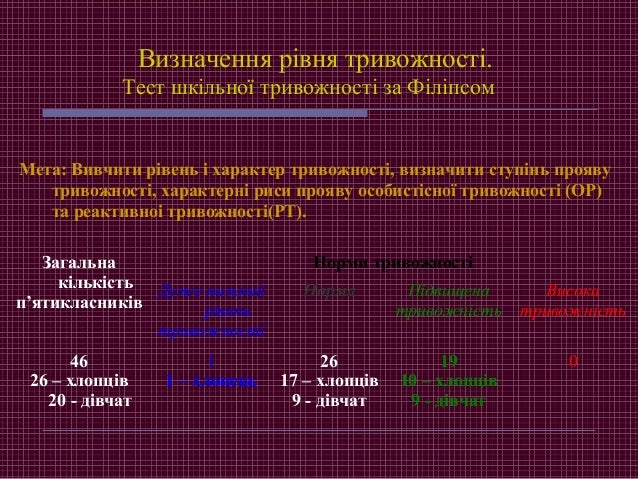 10. 10. Визначення рівня тривожності. Тест шкільної тривожності за Філіпсом Мета: Вивчити рівень і характер тривожності, визначити ступінь прояву тривожності, характерні риси прояву особистісної тривожності (ОР) та реактивноі тривожності(РТ). Загальна кількість п’ятикласників Норми тривожності Дуже низький рівень тривожності Норма Підвищена тривожність Висока тривожність 46 26 – хлопців 20 - дівчат 1 1 – хлопець 26 17 – хлопців 9 - дівчат 19 10 – хлопців 9 - дівчат 0