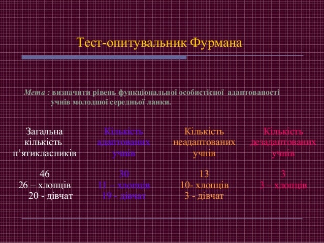 11. 11. Тест-опитувальник Фурмана Загальна кількість п’ятикласників Кількість адаптованих учнів Кількість неадаптованих учнів Кількість дезадаптованих учнів 46 26 – хлопців 20 - дівчат 30 11 – хлопців 19 - дівчат 13 10- хлопців 3 - дівчат 3 3 – хлопців Мета : визначити рівень функціональної особистісної адаптованості учнів молодшої середньої ланки.