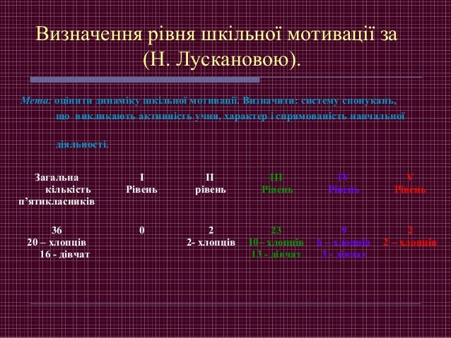 13. 13. Визначення рівня шкільної мотивації за (Н. Лускановою). Мета: оцінити динаміку шкільної мотивації. Визначити: систему спонукань, що викликають активність учня, характер і спрямованість навчальної діяльності. Загальна кількість п’ятикласників І Рівень ІІ рівень ІІІ Рівень ІV Рівень V Рівень 36 20 – хлопців 16 - дівчат 0 2 2- хлопців 23 10– хлопців 13 - дівчат 9 6 – хлопців 3 - дівчат 2 2 – хлопців