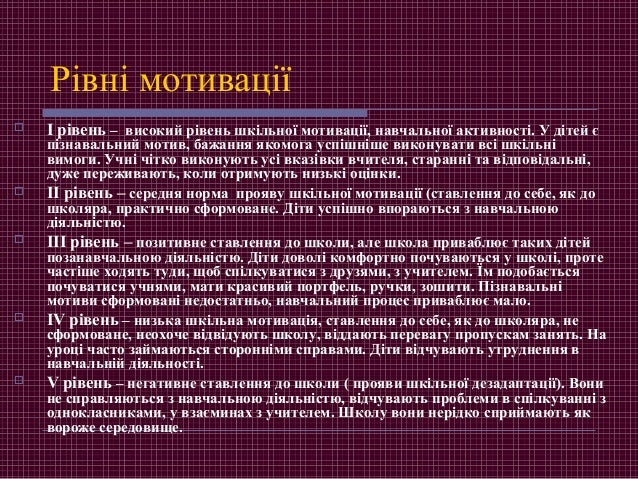 14. 14. Рівні мотивації  І рівень – високий рівень шкільної мотивації, навчальної активності. У дітей є пізнавальний мотив, бажання якомога успішніше виконувати всі шкільні вимоги. Учні чітко виконують усі вказівки вчителя, старанні та відповідальні, дуже переживають, коли отримують низькі оцінки.  ІІ рівень – середня норма прояву шкільної мотивації (ставлення до себе, як до школяра, практично сформоване. Діти успішно впораються з навчальною діяльністю.  ІІІ рівень – позитивне ставлення до школи, але школа приваблює таких дітей позанавчальною діяльністю. Діти доволі комфортно почуваються у школі, проте частіше ходять туди, щоб спілкуватися з друзями, з учителем. Їм подобається почуватися учнями, мати красивий портфель, ручки, зошити. Пізнавальні мотиви сформовані недостатньо, навчальний процес приваблює мало.  ІV рівень – низька шкільна мотивація, ставлення до себе, як до школяра, не сформоване, неохоче відвідують школу, віддають перевагу пропускам занять. На уроці часто займаються сторонніми справами. Діти відчувають утруднення в навчальній діяльності.  V рівень – негативне ставлення до школи ( прояви шкільної дезадаптації). Вони не справляються з навчальною діяльністю, відчувають проблеми в спілкуванні з однокласниками, у взаєминах з учителем. Школу вони нерідко сприймають як вороже середовище.