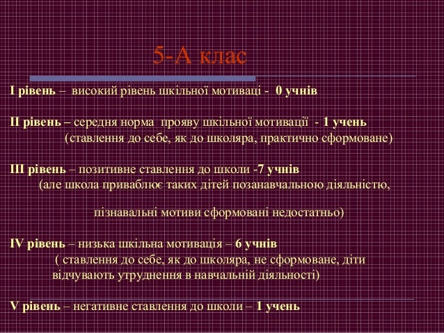 15. 15. 5-А клас І рівень – високий рівень шкільної мотиваці - 0 учнів ІІ рівень – середня норма прояву шкільної мотивації - 1 учень (ставлення до себе, як до школяра, практично сформоване) ІІІ рівень – позитивне ставлення до школи -7 учнів (але школа приваблює таких дітей позанавчальною діяльністю, пізнавальні мотиви сформовані недостатньо) ІV рівень – низька шкільна мотивація – 6 учнів ( ставлення до себе, як до школяра, не сформоване, діти відчувають утруднення в навчальній діяльності) V рівень – негативне ставлення до школи – 1 учень