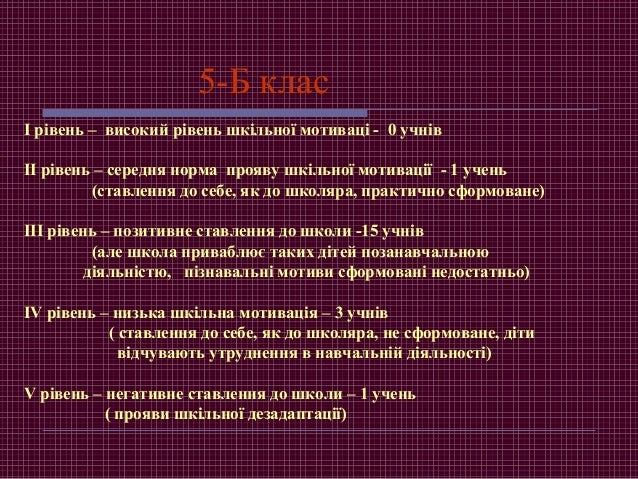 16. 16. 5-Б клас І рівень – високий рівень шкільної мотиваці - 0 учнів ІІ рівень – середня норма прояву шкільної мотивації - 1 учень (ставлення до себе, як до школяра, практично сформоване) ІІІ рівень – позитивне ставлення до школи -15 учнів (але школа приваблює таких дітей позанавчальною діяльністю, пізнавальні мотиви сформовані недостатньо) ІV рівень – низька шкільна мотивація – 3 учнів ( ставлення до себе, як до школяра, не сформоване, діти відчувають утруднення в навчальній діяльності) V рівень – негативне ставлення до школи – 1 учень ( прояви шкільної дезадаптації)