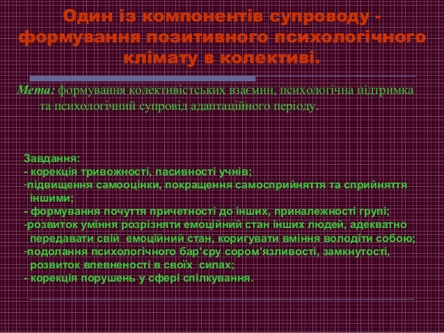 17. 17. Один із компонентів супроводу - формування позитивного психологічного клімату в колективі. Мета: формування колективістських взаємин, психологічна підтримка та психологічний супровід адаптаційного періоду. Завдання: - корекція тривожності, пасивності учнів; -підвищення самооцінки, покращення самосприйняття та сприйняття іншими; - формування почуття причетності до інших, приналежності групі; -розвиток уміння розрізняти емоційний стан інших людей, адекватно передавати свій емоційний стан, коригувати вміння володіти собою; -подолання психологічного бар’єру сором’язливості, замкнутості, розвиток впевненості в своїх силах; - корекція порушень у сфері спілкування.