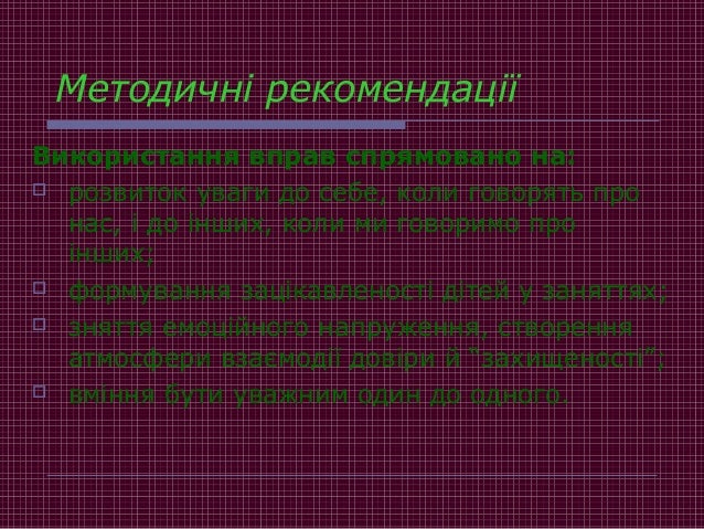 18. 18. Методичні рекомендації Використання вправ спрямовано на:  розвиток уваги до себе, коли говорять про нас, і до інших, коли ми говоримо про інших;  формування зацікавленості дітей у заняттях;  зняття емоційного напруження, створення атмосфери взаємодії довіри й “захищеності”;  вміння бути уважним один до одного.