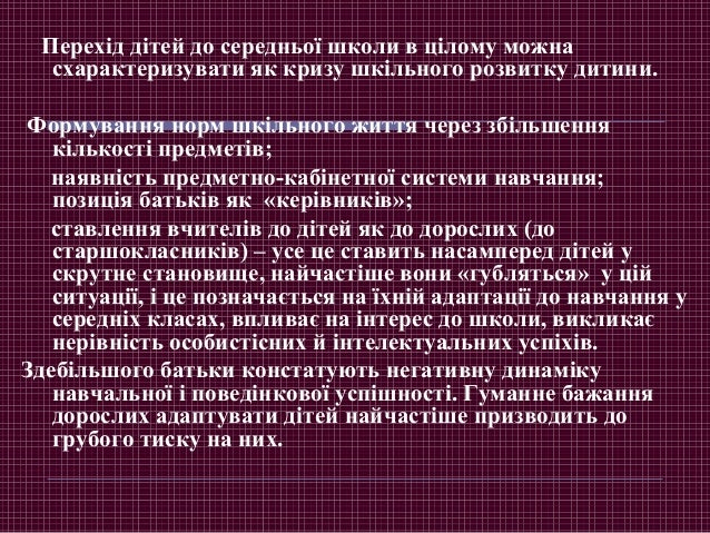 2. 2. Перехід дітей до середньої школи в цілому можна схарактеризувати як кризу шкільного розвитку дитини. Формування норм шкільного життя через збільшення кількості предметів; наявність предметно-кабінетної системи навчання; позиція батьків як «керівників»; ставлення вчителів до дітей як до дорослих (до старшокласників) – усе це ставить насамперед дітей у скрутне становище, найчастіше вони «губляться» у цій ситуації, і це позначається на їхній адаптації до навчання у середніх класах, впливає на інтерес до школи, викликає нерівність особистісних й інтелектуальних успіхів. Здебільшого батьки констатують негативну динаміку навчальної і поведінкової успішності. Гуманне бажання дорослих адаптувати дітей найчастіше призводить до грубого тиску на них.