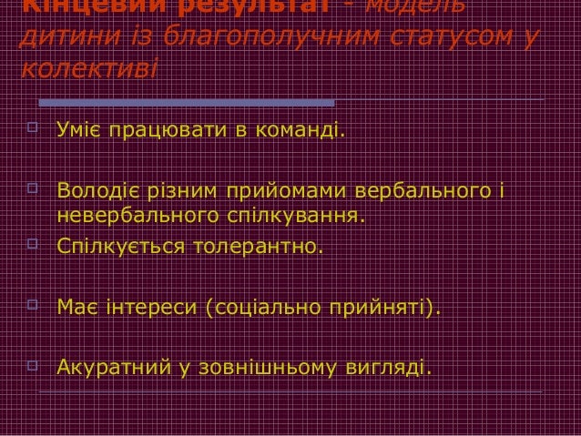 20. 20. Кінцевий результат - модель дитини із благополучним статусом у колективі  Уміє працювати в команді.  Володіє різним прийомами вербального і невербального спілкування.  Спілкується толерантно.  Має інтереси (соціально прийняті).  Акуратний у зовнішньому вигляді.