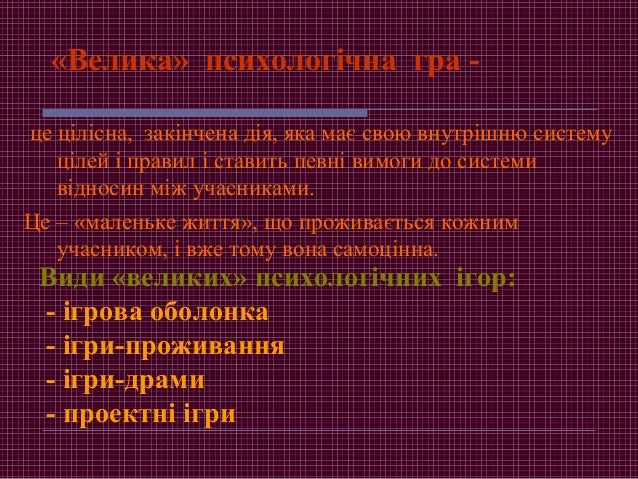21. 21. «Велика» психологічна гра - це цілісна, закінчена дія, яка має свою внутрішню систему цілей і правил і ставить певні вимоги до системи відносин між учасниками. Це – «маленьке життя», що проживається кожним учасником, і вже тому вона самоцінна. Види «великих» психологічних ігор: - ігрова оболонка - ігри-проживання - ігри-драми - проектні ігри