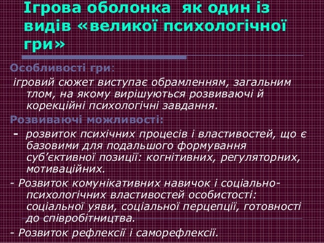 23. 23. Ігрова оболонка як один із видів «великої психологічної гри» Особливості гри: ігровий сюжет виступає обрамленням, загальним тлом, на якому вирішуються розвиваючі й корекційні психологічні завдання. Розвиваючі можливості: - розвиток психічних процесів і властивостей, що є базовими для подальшого формування суб’єктивної позиції: когнітивних, регуляторних, мотиваційних. - Розвиток комунікативних навичок і соціально- психологічних властивостей особистості: соціальної уяви, соціальної перцепції, готовності до співробітництва. - Розвиток рефлексії і саморефлексії.