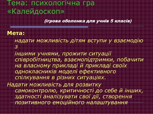 24. 24. Тема: психологічна гра «Калейдоскоп» (ігрова оболонка для учнів 5 класів) Мета: надати можливість дітям вступи у взаємодію з іншими учнями, прожити ситуації співробітництва, взаємопідтримки, побачити на власному прикладі й прикладі своїх однокласників моделі ефективного спілкування в різних ситуаціях. Надати можливість для розвитку самоконтролю, критичності до себе й інших, здатності аналізувати свої дії, створення позитивного емоційного налаштування
