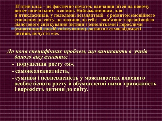 4. 4. П’ятий клас – це фактично початок навчання дітей на новому витку навчальних взаємин. Найважливішим, для п’ятикласників, у подоланні дезадаптації є розвиток емоційного ставлення до світу, до людини, до себе – пов’язане з організацією діалогового спілкування дитини з однолітками і дорослими (емпатичний спосіб спілкування), розвиток самосвідомості дитини, почуття «я». До кола специфічних проблем, що виникають в учнів даного віку входять: - порушення росту «я», - самонеадекватність, - сумніви і невпевненість у можливостях власного особистісного росту й обумовленні ними тривожність і ворожість дитини до світу.