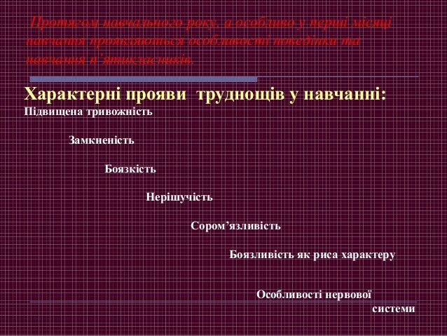 5. 5. Протягом навчального року, а особливо у перші місяці навчання проявляються особливості поведінки та навчання п’ятикласників. Характерні прояви труднощів у навчанні: Підвищена тривожність Замкненість Боязкість Нерішучість Сором’язливість Боязливість як риса характеру Особливості нервової системи
