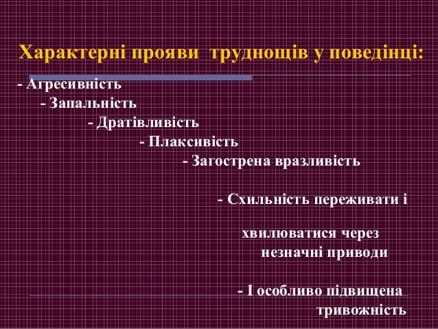 6. 6. Характерні прояви труднощів у поведінці: - Агресивність - Запальність - Дратівливість - Плаксивість - Загострена вразливість - Схильність переживати і хвилюватися через незначні приводи - І особливо підвищена тривожність
