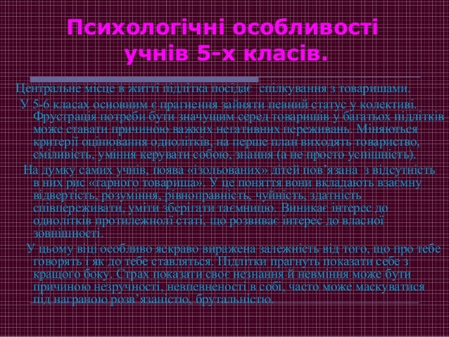 7. 7. Психологічні особливості учнів 5-х класів. Центральне місце в житті підлітка посідає спілкування з товаришами. У 5-6 класах основним є прагнення зайняти певний статус у колективі. Фрустрація потреби бути значущим серед товаришів у багатьох підлітків може ставати причиною важких негативних переживань. Міняються критерії оцінювання однолітків, на перше план виходять товариство, сміливість, уміння керувати собою, знання (а не просто успішність). На думку самих учнів, поява «ізольованих» дітей пов’язана з відсутність в них рис «гарного товариша». У це поняття вони вкладають взаємну відвертість, розуміння, рівноправність, чуйність, здатність співпереживати, уміти зберігати таємницю. Виникає інтерес до однолітків протилежнолї статі, що розвиває інтерес до власної зовнішності. У цьому віці особливо яскраво виражена залежність від того, що про тебе говорять і як до тебе ставляться. Підлітки прагнуть показати себе з кращого боку. Страх показати своє незнання й невміння може бути причиною незручності, невпевненості в собі, часто може маскуватися під награною розв’язаністю, брутальністю.