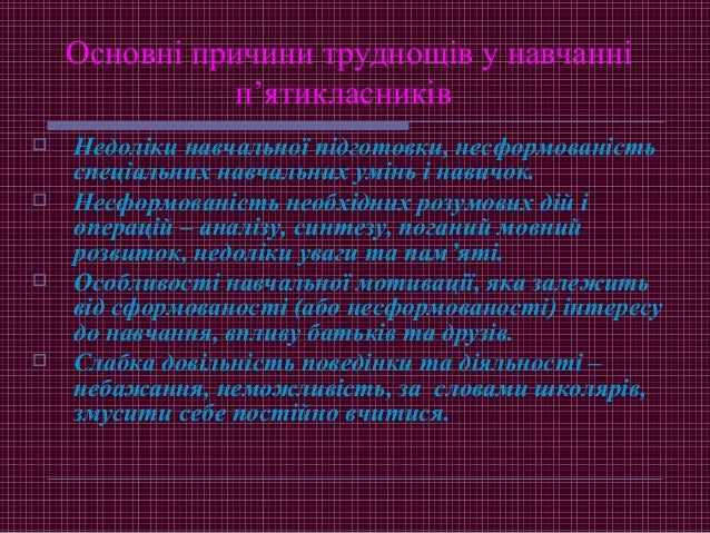 8. 8. Основні причини труднощів у навчанні п’ятикласників  Недоліки навчальної підготовки, несформованість спеціальних навчальних умінь і навичок.  Несформованість необхідних розумових дій і операцій – аналізу, синтезу, поганий мовний розвиток, недоліки уваги та пам’яті.  Особливості навчальної мотивації, яка залежить від сформованості (або несформованості) інтересу до навчання, впливу батьків та друзів.  Слабка довільність поведінки та діяльності – небажання, неможливість, за словами школярів, змусити себе постійно вчитися.