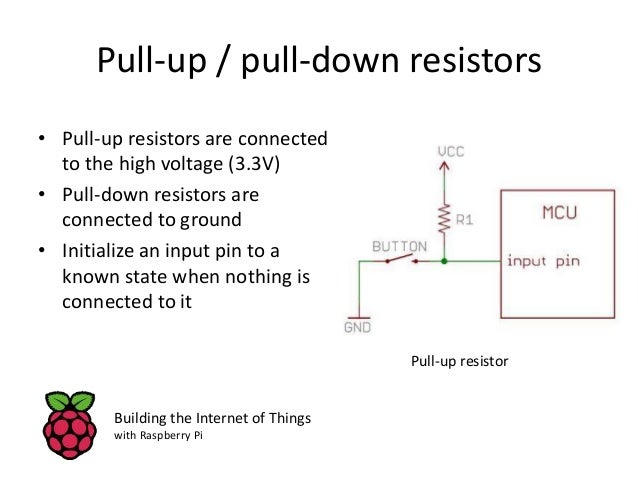 10. 10. Pull-up / pull-down resistors • Pull-up resistors are connected to the high voltage (3.3V) • Pull-down resistors are connected to ground • Initialize an input pin to a known state when nothing is connected to it Building the Internet of Things with Raspberry Pi Pull-up resistor