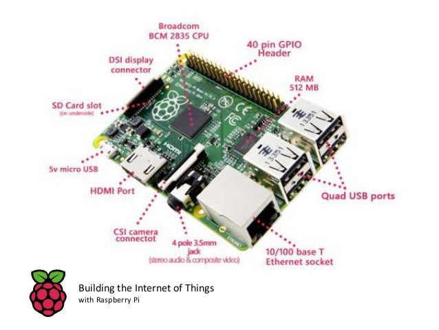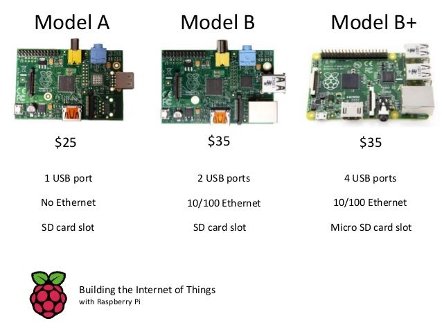 5. 5. Model A Model B Model B+ $25 $35 $35 1 USB port 2 USB ports 4 USB ports No Ethernet 10/100 Ethernet 10/100 Ethernet SD card slot SD card slot Micro SD card slot Building the Internet of Things with Raspberry Pi