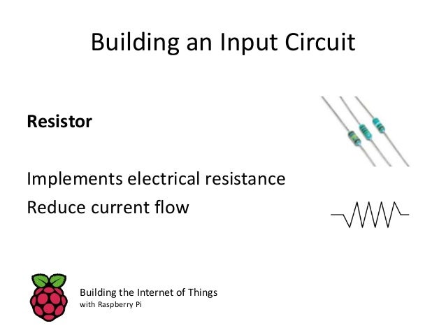 9. 9. Building an Input Circuit Resistor Implements electrical resistance Reduce current flow Building the Internet of Things with Raspberry Pi