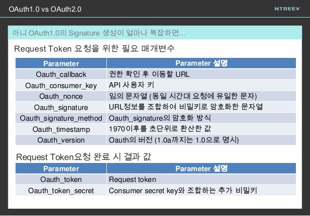 10. 10. OAuth1.0 vs OAuth2.0 아니 OAuth1.0의 Signature 생성이 얼마나 복잡하면… Parameter Parameter 설명 Oauth_callback 권한 확인 후 이동할 URL Oauth_consumer_key API 사용자 키 Oauth_nonce 임의 문자열 (동일 시간대 요청에 유일한 문자) Oauth_signature URL정보를 조합하여 비밀키로 암호화한 문자열 Oauth_signature_method Oauth_signature의 암호화 방식 Oauth_timestamp 1970이후를 초단위로 환산한 값 Oauth_version Oauth의 버전 (1.0a까지는 1.0으로 명시) Request Token 요청을 위한 필요 매개변수 Parameter Parameter 설명 Oauth_token Request token Oauth_token_secret Consumer secret key와 조합하는 추가 비밀키 Request Token요청 완료 시 결과 값