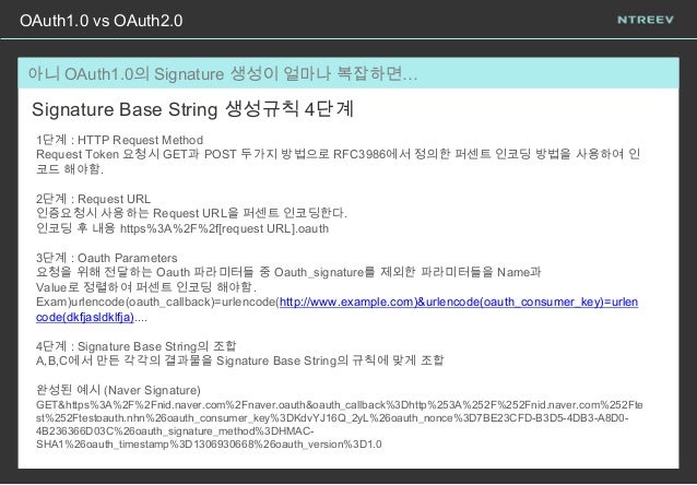 11. 11. 아니 OAuth1.0의 Signature 생성이 얼마나 복잡하면… OAuth1.0 vs OAuth2.0 Signature Base String 생성규칙 4단계 1단계 : HTTP Request Method Request Token 요청시 GET과 POST 두가지 방법으로 RFC3986에서 정의한 퍼센트 인코딩 방법을 사용하여 인 코드 해야함. 2단계 : Request URL 인증요청시 사용하는 Request URL을 퍼센트 인코딩한다. 인코딩 후 내용 https%3A%2F%2f[request URL].oauth 3단계 : Oauth Parameters 요청을 위해 전달하는 Oauth 파라미터들 중 Oauth_signature를 제외한 파라미터들을 Name과 Value로 정렬하여 퍼센트 인코딩 해야함. Exam)urlencode(oauth_callback)=urlencode(http://www.example.com)&urlencode(oauth_consumer_key)=urlen code(dkfjasldklfja).... 4단계 : Signature Base String의 조합 A,B,C에서 만든 각각의 결과물을 Signature Base String의 규칙에 맞게 조합 완성된 예시 (Naver Signature) GET&https%3A%2F%2Fnid.naver.com%2Fnaver.oauth&oauth_callback%3Dhttp%253A%252F%252Fnid.naver.com%252Fte st%252Ftestoauth.nhn%26oauth_consumer_key%3DKdvYJ16Q_2yL%26oauth_nonce%3D7BE23CFD-B3D5-4DB3-A8D0- 4B236366D03C%26oauth_signature_method%3DHMAC- SHA1%26oauth_timestamp%3D1306930668%26oauth_version%3D1.0