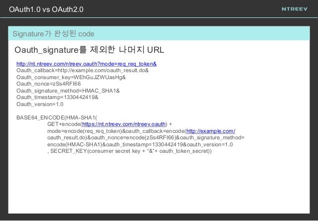 12. 12. Signature가 완성된 code OAuth1.0 vs OAuth2.0 Oauth_signature를 제외한 나머지 URL http://nt.ntreev.com/ntreev.oauth?mode=req_req_token& Oauth_callback=http://example.com/oauth_result.do& Oauth_consumer_key=WEhGuJZWUasHg& Oauth_nonce=zSs4RFI66 Oauth_signature_method=HMAC_SHA1& Oauth_timestamp=1330442419& Oauth_version=1.0 BASE64_ENCODE(HMA-SHA1( GET+encode(https://nt.ntreev.com/ntreev.oauth) + mode=encode(req_req_token)&oauth_callback=encode(http://example.com/ oauth_result.do)&oauth_nonce=encode(zSs4RFI66)&oauth_signature_method= encode(HMAC-SHA1)&oauth_timestamp=1330442419&oauth_version=1.0 , SECRET_KEY(consumer secret key + “&”+ oauth_token_secret))