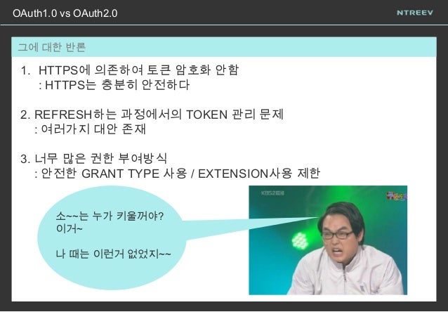 15. 15. OAuth1.0 vs OAuth2.0 당…당황하셨어요~? 그에 대한 반론 1. HTTPS에 의존하여 토큰 암호화 안함 : HTTPS는 충분히 안전하다 2. REFRESH하는 과정에서의 TOKEN 관리 문제 : 여러가지 대안 존재 3. 너무 많은 권한 부여방식 : 안전한 GRANT TYPE 사용 / EXTENSION사용 제한 소~~는 누가 키울꺼야? 이거~ 나 때는 이런거 없었지~~